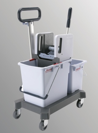 - Wózek do sprzątania posiada lekkie, ale solidne wiadro z wygodnym uchwytem i litrową podziałką wewnątrz, uchwytem do wylewania cieczy od spodu wiadra i wyciskarką